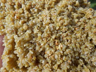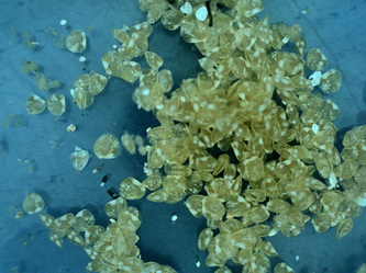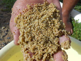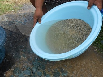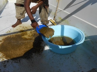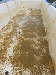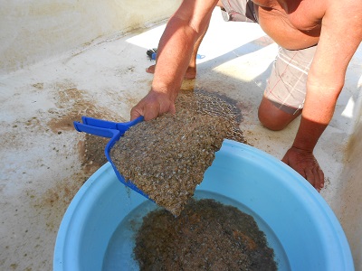 This is now November and our oldest clams are 7 months and growing well; they also need more cleaning and for that we simply drain the raceway, scrape the clams into a heap, take the whole mess out to separate the clams from the dirt and put the clean juvenile clams in a clean raceway for them to continue to grow under the best possible conditions.
