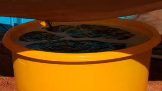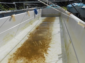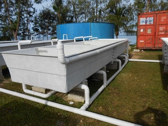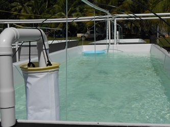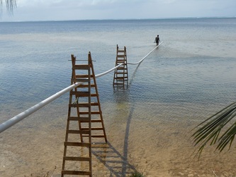 Feb 21, another week without rain, so we finished the air-lines over the raceways and worked on setting up the sea-line water intake for the whole hatchery. We had a few anxious moments with that long PVC pipe going out about 120 meters but at the end all went well and we started testing our diesel pump to fill the big elevated blue water storage tank. After 30 minutes pumping, at 2/3 full we had the biggest disappointment of the week when one corner of the storage tank started to collapse on itself and leaking, showing a structural defect in the manufacturing.