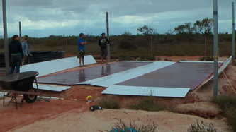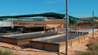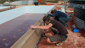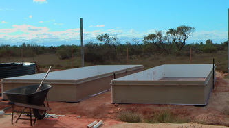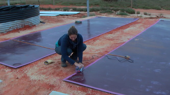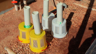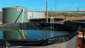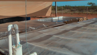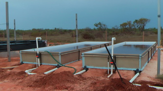 Feb 14, taking advantage of the good weather we started the above ground water intake plumbing and drainage, finished the brood-stock tank and tried out the fiberglass rod frame system for the air outlets; all worked out fine and we are now only one week away from being fully operational.