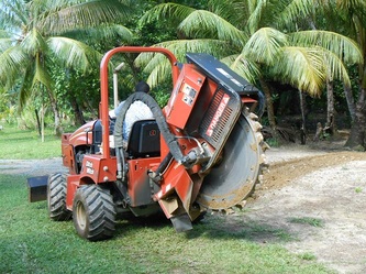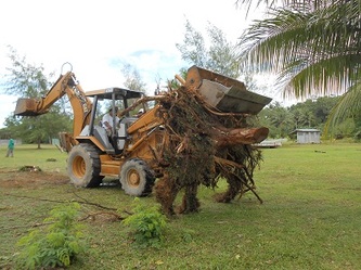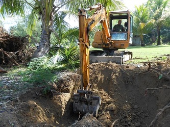 After a 2 days Typhoon disruption we wanted to start of the footings of the raceways, but soon realized we had to remove the tree-stumps and their enormous root-systems first. We called in some heavy equipment and 2 hours later it was all done, but then we had to get rid of all those stumps, so we called in some even heavier equipment which buried the lot and fixed our boat inlet wall in the mangroves. As bonus we ended with some 20% more usable land area, 9/11/2014. Next week we start on the 14 raceways footings.