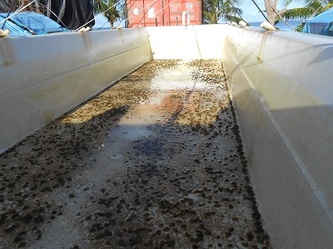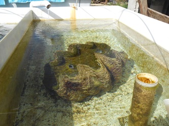 At the end of August, we had to wrap a large black plastic tarpaulin around our water storage tank which was getting too hot after we cut the trees that were shading it but also shedding their leaves in our raceways during the heavy winds from the tropical depressions. We had some major success with 2 new spawnings of the more common T.Maxima and even T.Squamosa. We are now preparing for the much anticipated visit of a very important visitor from the SPC in Noumea who will investigate if and how SPC could help the Yap farmers getting in on the 'action'.