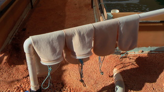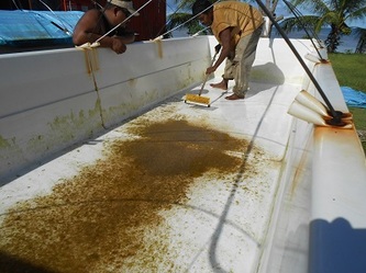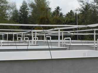 By the middle of April, exactly seven months after my arrival in Yap, I was finally able to move to live on the hatchery site and Yap Telecom came with a very clever machine to dig and install my new phone line which also connected me back again to the Internet. To avoid any more surprises with the unpredictable climate, we started making some temporary rain protections over the raceways with the only flimsy material available here in Yap and so far it's working. So we continued spawning again and had very good success with the Maximas filling 3 raceways with millions of healthy larvae which are now only a few days from settlement. The Derasa brood-stock will need some 'conditioning' for a few weeks before trying another spawning attempt.
