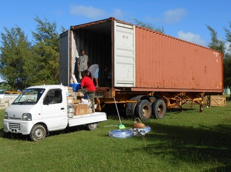 After some problems with shipping delays, "D" day finally arrived on 11 January in the New Year; first the small container with all the raceways which is going to be our future workshop, then the BIG one with all the rest of the hardware like electric & diesel pumps, blowers, a generator, PVC pipes & fittings, water storage tank etc etc, plus the 2 house containers elements which are going to be my on-site accommodation. Now the 'serious' work can finally start!