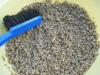 Even the 3 months old Maxima seed-clams only 3mm in size need regular scraping and cleaning to survive; it may seem a very rough way of doing this, but it's the only way to make sure our mortality rate remains practically undetectable.