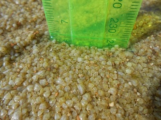 These last pictures from TMDC were taken before Christmass 2014 after we cleaned all the 4 raceways with juvenile clams at the same time; the 32cm plastic basin has a 6cm layer of small clams 1-3mm in size or 7lt (2 gallon), an estimated well over 2.5 million juvenile clams, all obtained from only 8 spawning clams into 3 raceways. Our biggest juvenile Derasa sitting on a Maxima brood-stock was 51mm at an age of 7 months and 3 weeks; normally it takes one year to reach 50mm for T,Derasa.